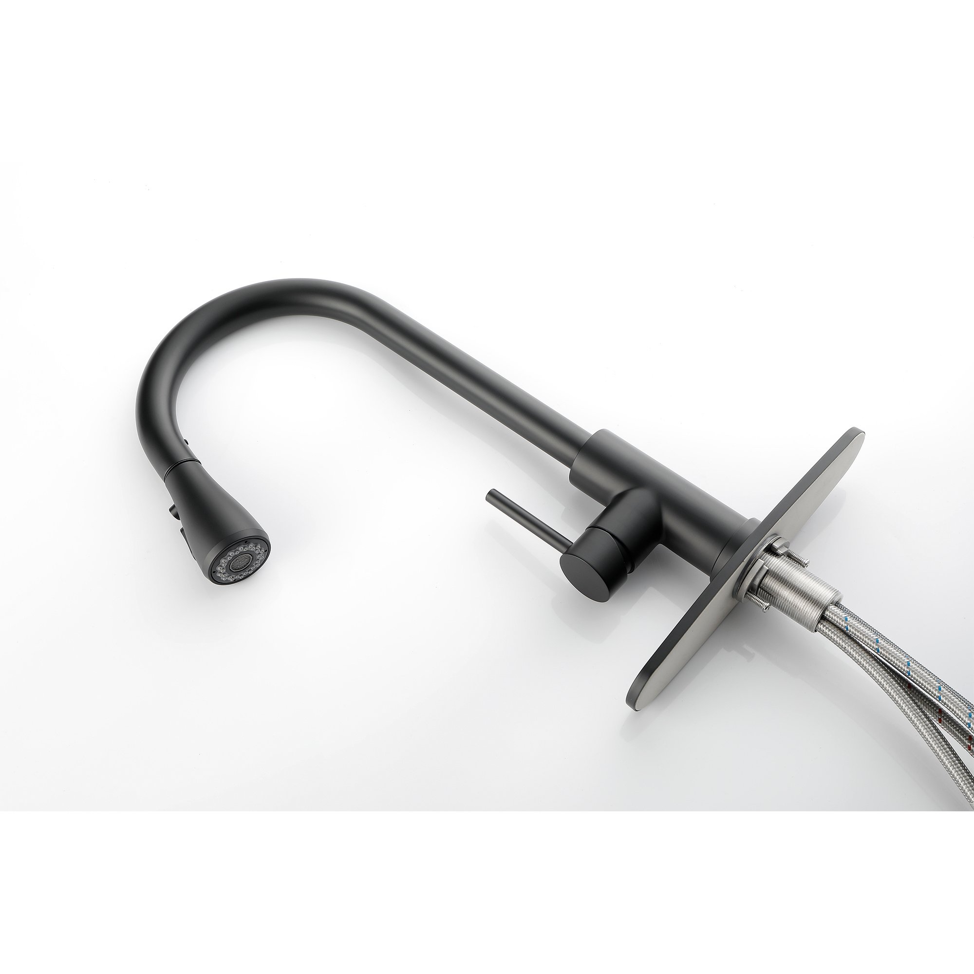 The kitchen faucet with pull-down sprayer has a simple and stylish design that easily matches most sinks. Three water outlet functions (stream, spray and pause) to meet your various water use situations. The high-arc nozzle rotates 360 degrees to provide all-round cleaning, and the single-handle design allows easy control of water temperature and flow rate. For daily cleaning, just clean the faucet with a rag and it will look like new.
